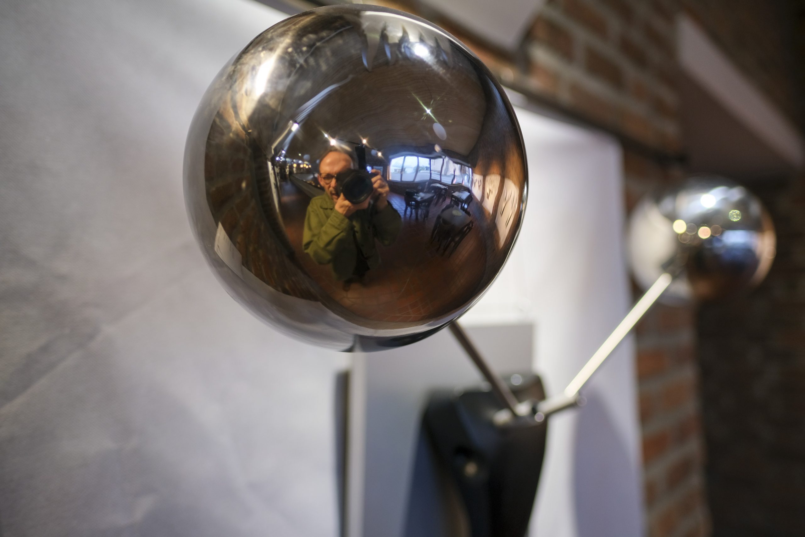 Hier sind es zwei Edelstahlkugeln auf Edelstahlstäben, die den sie umgebenden Raum widerspiegeln.