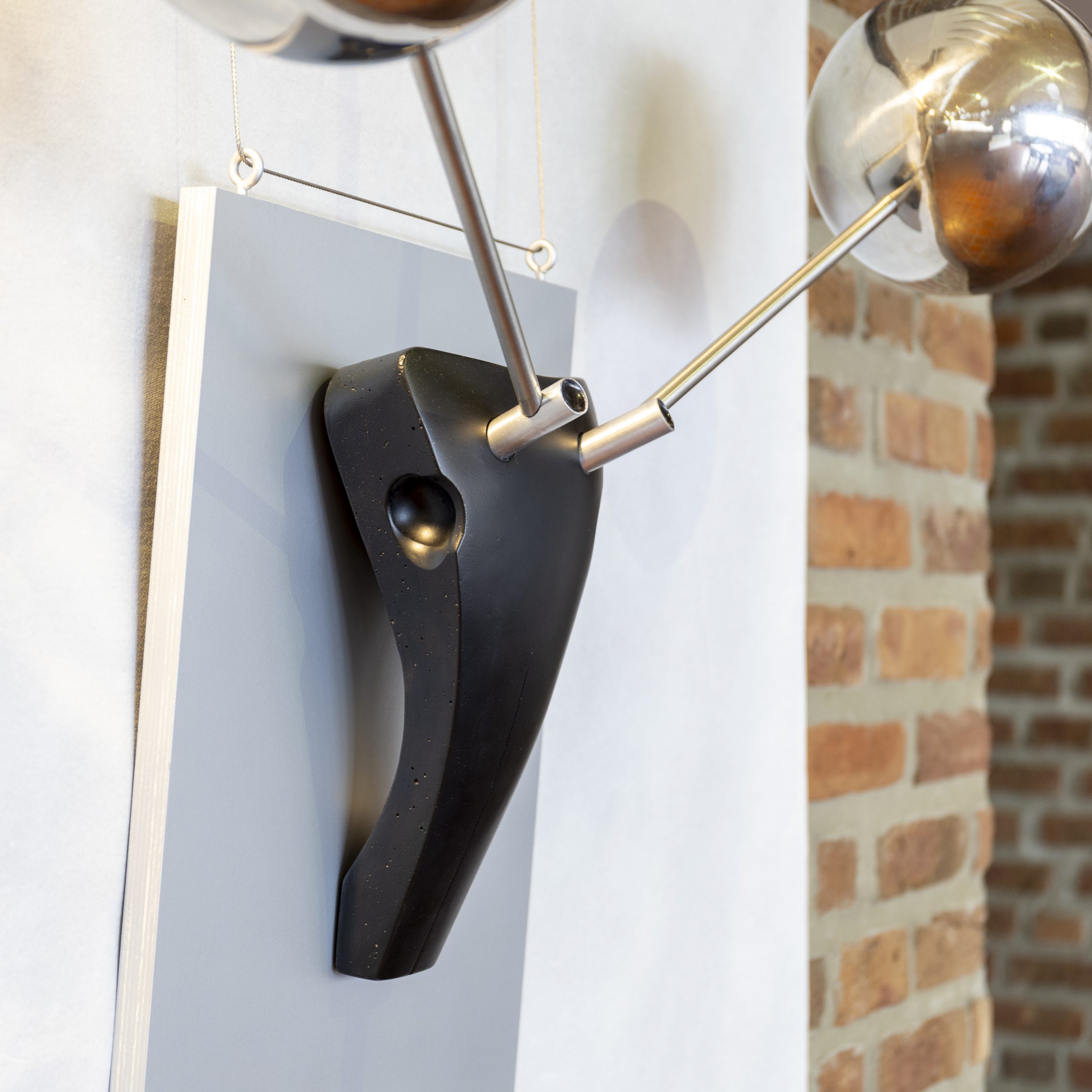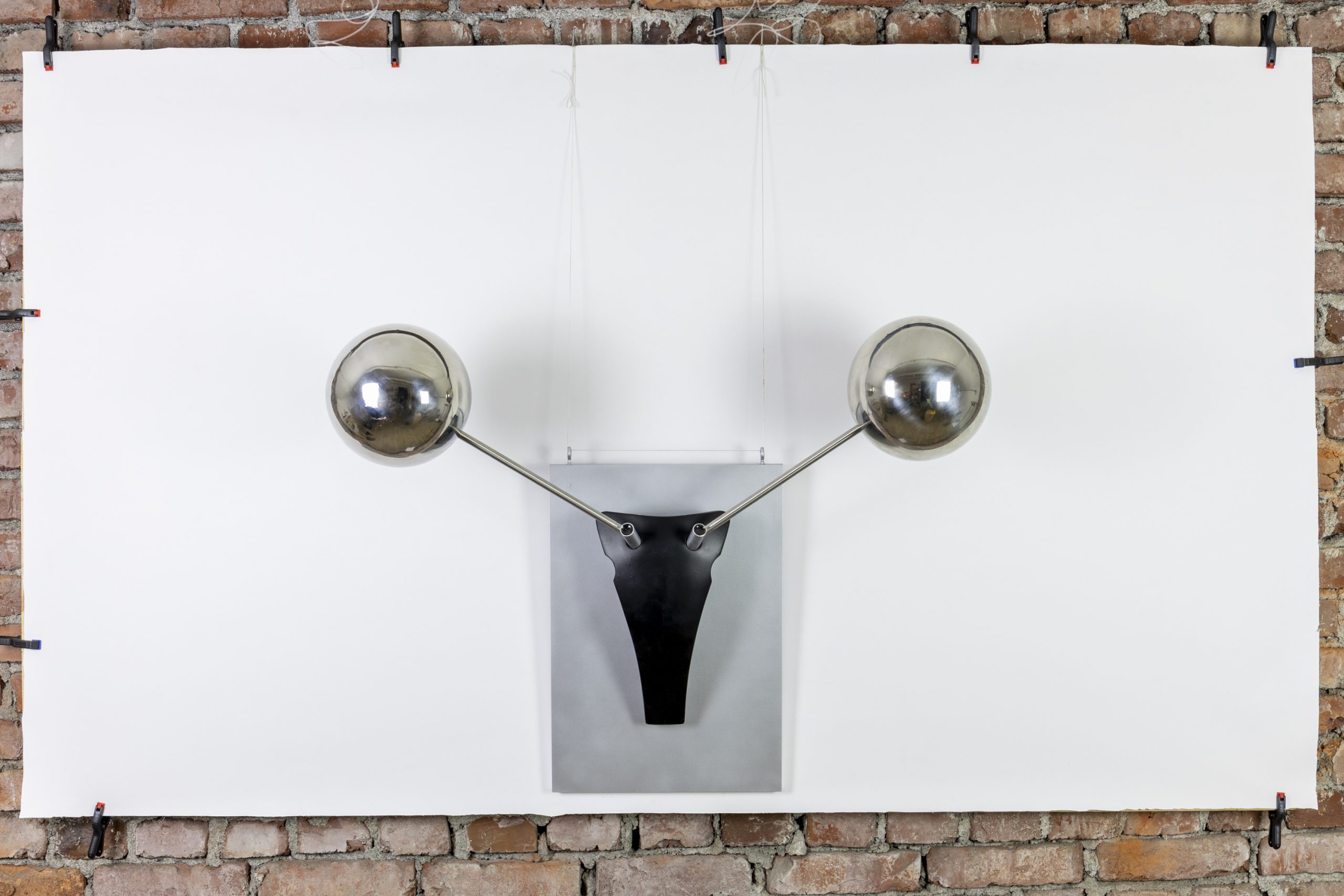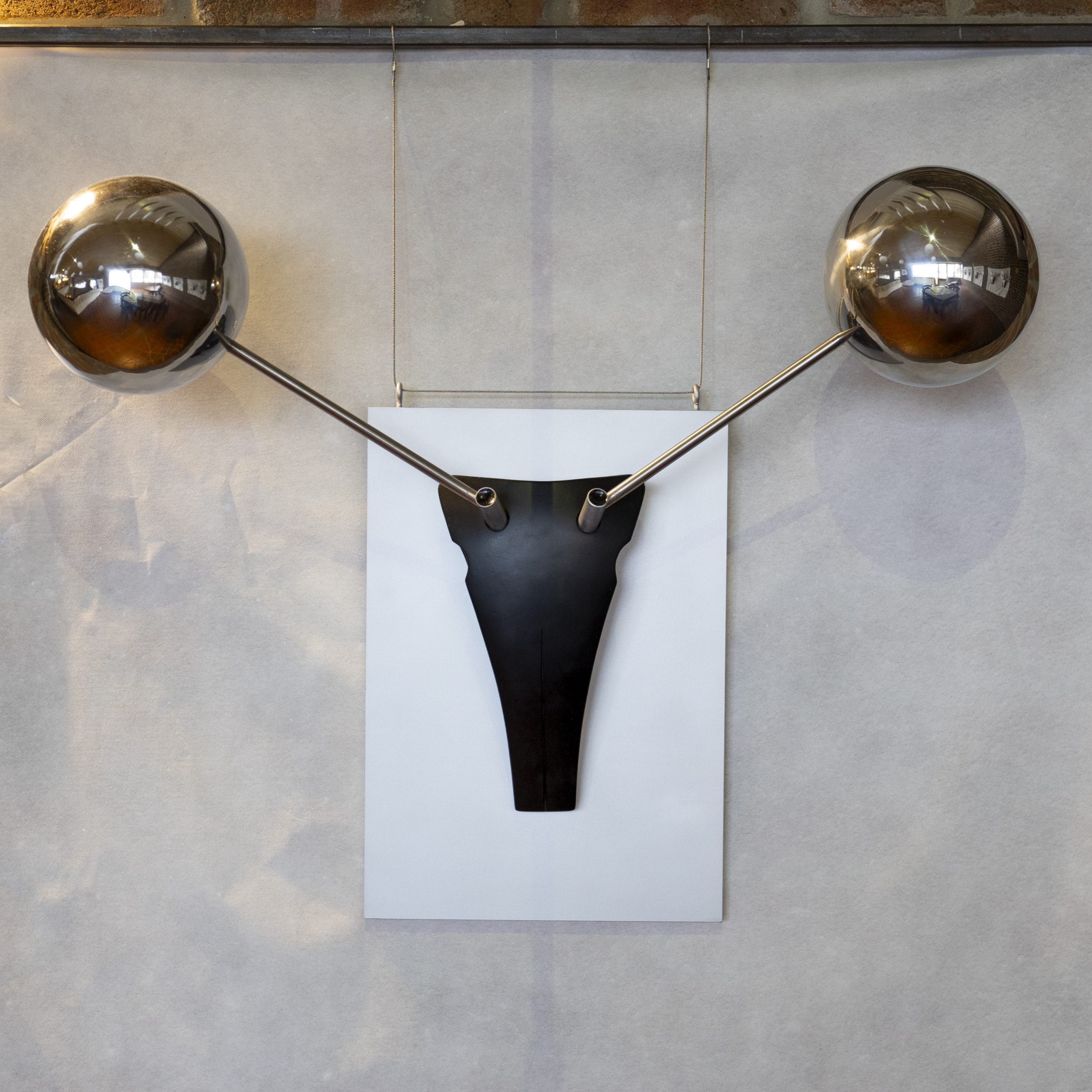 „Observer“ ist eine Wandskulptur aus einer Reihe mit speziellen Edelstahlhalterungen, die die Aufnahme von verschiedenen „Geweihen“ ermöglicht.